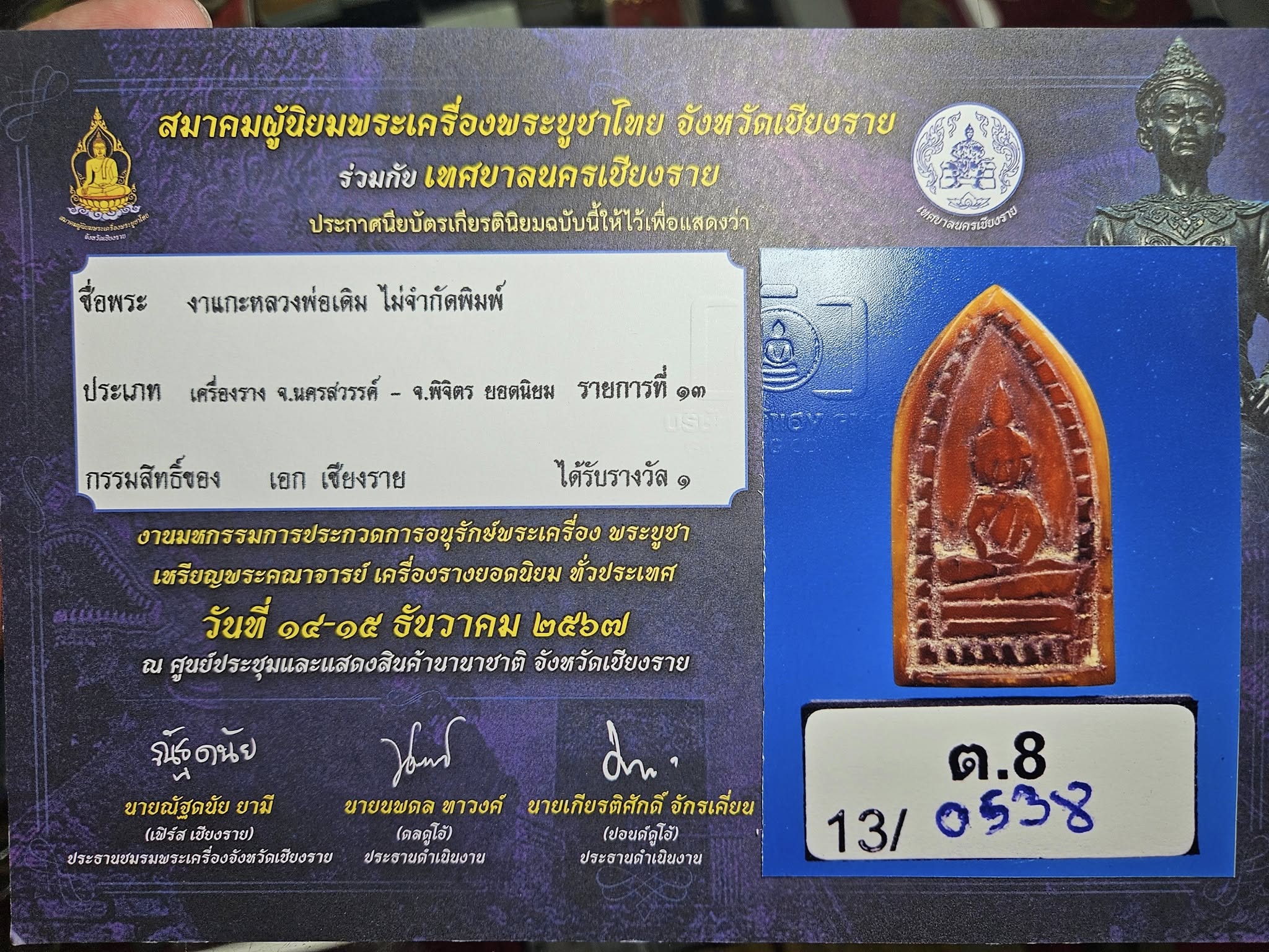 這尊龍婆等牙招財女神佛祖相,約2480-90年、也是全泰招財女神最著名系列之一,是我在清邁大比賽場地時看到曼谷的老友帶上來然後收下去比賽,很好的拿下第一名,其老味道明顯不是雪白那種,但品相仍然很優,更重要是價格便宜~~比賽證書已出四位數供金可來詢代包殼回港